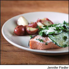 3. While the salmon is cooking, mix the yogurt, garlic, lemon juice and cucumbers with 2 tablespoons of olive oil, and season with salt and pepper to taste. Spoon the mixture over the cooked salmon and serve. Serves 4.