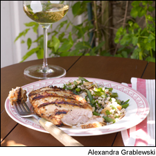 Backyard grilling adds a touch of glamour to weeknights in the summer. Try this simple grilled chicken recipe, which borrows bold flavors from the Mediterranean kitchen. A lightly oaked California Chardonnay makes a terrific wine match. Tangy yogurt tenderizes the meat, while aromatic pimentón de La Vera lends a subtle smokiness that is amplified by the char from the grill. In the grain salad made from tender barley, green beans and parsley, toasted almonds help to orient the dish to the spicy, buttery notes from the oak in the wine.