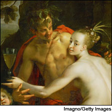 But wine played a role in real-life matchmaking as well as in bardly boasting. Gifts of wine were always popular in Europe as demonstration of romantic interest (and of having the scratch to buy wine). In medieval Venice, for the Festival of the Twelve Marys, young men paraded to a church to give out desserts and wine to eligible bachelorettes; the next day, the gentleman callers would find the ladies again, this time at the homes of wealthy town dignitaries, where they would once again woo them with wine and sweets, as described in A. Lynn Martin's Alcohol, Sex and Gender in Late Medieval and Early Modern Europe. Some have interpreted a symbolism to this giving and receiving that had nothing to do with drinks and candy. At any rate, the powers-that-be eventually felt the need to put an end to these coed mixers, lest youngsters celebrate the Holy Mother with conceptions of their own.