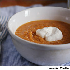 4. Pour the squash soup mixture into a clean blender and puree until smooth, then pour the pureed squash back into the stockpot, adding the strained chile-cream mixture. Heat the pureed soup over medium-high heat while stirring until it just boils. Ladle the soup into four bowls and top with a tablespoon of sour cream. Serve immediately. Serves 4.