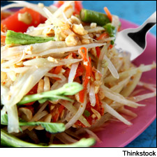 When shopping for a green papaya, which has become increasingly common in American markets with the rising popularity of Thai flavors and ingredients, Yoon says that the ideal fruit is green-skinned and utterly unripe. "They're small, mostly imported from Thailand, and a very different thing from the gigantic Mexican papayas," he explained. "The texture is very crisp, almost like a Granny Smith apple." To pour, he suggests Riesling, a classic pairing with the often fiery-yet-sweet flavors of Southeast Asia. In addition, "It's a wine that can handle the assertive flavors of fish sauce and lime juice so common to Thai dishes." We've included a list of recently rated Rieslings below.