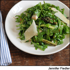 Asparagus gets used in the salad two ways: the raw portion is shaved into long ribbons with a vegetable peeler, while the other half is roasted to a nice golden-brown char. If you’re running short on time, you can choose one or the other, but the two preparations make a nice textural and flavor contrast when working with an otherwise minimalist list of ingredients.