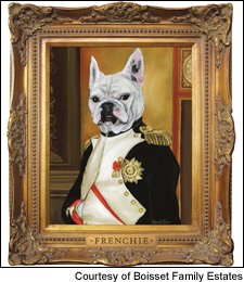 • The dog days of summer are well-upon us, and one Napa winery is celebrating the season with a new line of wines inspired by its owner's French bulldog, and which will also benefit the ASPCA. Frenchie the French Bulldog is owned by Raymond Vineyards' Jean-Charles Boisset and his wife, Gina Gallo. Portraits of Frenchie in label-themed costumes adorn each of the Frenchie Winery bottlings—2009 Frenchie Napoleon red blend, Louis XIV Cabernet Sauvignon and soon-to-be-released Marie Antoinette white blend—with $1 donated to the ASPCA for each of the $30 bottles purchased (Boisset says a minimum of $5,000 will be donated). Boisset and Raymond Vineyards aren't just helping out man's best friends by supporting the ASPCA, either: Frenchie Winery features a tasting room at Raymond designed specifically for dogs. It offers five kennel spaces for visiting pets with dog beds made from wine barrels and an outdoor play area. Human visitors to Raymond's main tasting room can keep tabs on their pups via the doggie-cam. This Saturday, Frenchie Winery's first ever "Bark-B-Que" ($25 for adults; no charge for dogs) will offer plenty of food and wine, and a mobile pet groomer, with a portion of the proceeds donated to the Napa Humane Society.