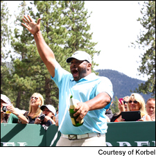 • Wine-loving golfers and golf-loving wine lovers around the world (there are a lot of you out there) tuned in to the Open Championship at Royal Lytham & St. Annes Golf Club in Lancashire, England, this past weekend to see South African vintner (and former world No. 1-ranked golfer) Ernie Els hoist Unfiltered's favorite trophy in all of sport, the Claret Jug. Across the pond, meanwhile, there were some much less serious—and far more sparkling wine-soaked—rounds of golf being played at the American Century Celebrity Golf Championships in Lake Tahoe, Nev. Korbel has long been a sponsor of the sports star-studded event and hosts numerous charity events during the weekend in Tahoe. The Korbel Celebrity Spray-Off kicked off the festivities this past Thursday, with current and retired pro athletes including Green Bay Packers Aaron Rodgers and A.J. Hawk, Cowboys QB Tony Romo and NFL Hall of Famers John Elway and Jerry Rice heading up a strong contingent of football players. Still thirsty after his Miami Heat celebrated their championship with a Nebuchadnezzar of Ace of Spades Champagne, Shane Battier popped off a cork shot of 100 feet, but he missed the Bus: Former Steelers running back Jerome Bettis won with a pop of 110 feet, earning $5,000 from the Korbel Toast Life Foundation for the charity of his choice. Elway continued the gridiron-great dominance in the closest-to-the-pin competition, earning a $5,000 check from Korbel for the Lake Tahoe Community College Foundation. The Packers' Hawk may have just been letting the old guys win, though: Korbel sponsored his Hawk's Locks for Kids fund-raiser, benefiting Wigs for Kids, with a $5,000 donation just this past June.