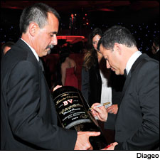 • When it comes to wine, the gents in Mad Men usually stick to celebratory bubbly, but even with the amount of Scotch they put back, Unfiltered imagines it would take them at least a full two episodes to polish off a 27-liter bottle of wine. At last month's 64th annual Primetime Emmy Awards Ceremony, the Mad Men were out in force, but the quaff of choice was wine—specifically, official sponsor Beaulieu Vineyard of Napa, which created a custom-etched and -painted bottle of Georges de Latour Private Reserve Cabernet Sauvignon 2009 as tall as a 6-year-old. At 3.5 feet standing and 110 pounds, the 27-liter brute undoubtedly gave BV winemaker Jeffrey Stambor a solid upper-body workout as he carted it around backstage, collecting autographs in gold ink from small-screen luminaries. (Wine nerd trivia: Recall that nonstandard bottle sizes go by biblical names—this one, holding 36 regular bottles, is a Goliath.) The big bottle served as an unoffical "guest book" of nominees, and like last year's, will be available for purchase to benefit educational programs of the Academy of Television Arts & Sciences Foundation.