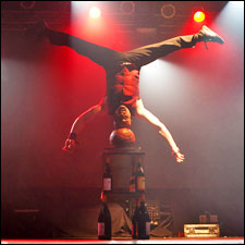 • At today's Georges Duboeuf Beaujolais Nouveau midnight launch party in New York, the theme, to celebrate the 30th anniversary of the Nouveau U.S. partnership between Duboeuf and importer Deutsch Family Wine & Spirits, was "Magique." The carnivalesque atmosphere sure lived up to that. A few character sketches in the Unfiltered notebook: "man in a fat suit lip-syncing opera and doing high kicks and flips," "stilts people dressed like a bird," "vest guy playing a xylophone thing, big hair," and the coup de grace, "topless head-between-legs woman." (That would be performance artist Narcissister, who wore a mask on her face, a mask on the back of her head and a mannequin head between her legs so she could flip over to a handstand and wave her legs like arms, which was all very disorienting to Unfiltered at 1:30 in the morning.)